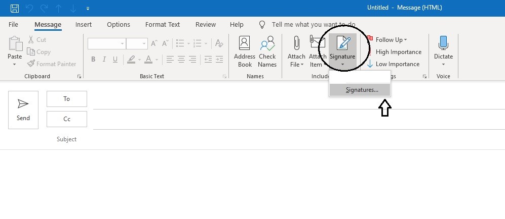 After you command Outlook to open a new email, a box named ‘United – Message (HTML)’ would appear on your screen. Next, you should maximize this box. Skim thoroughly at the Ribbon and choose ‘Signature’ icon. If you don’t find the ‘Signature’ icon as shown in the picture above, go to ‘Insert’ in the Toolbar and choose ‘Signature’.