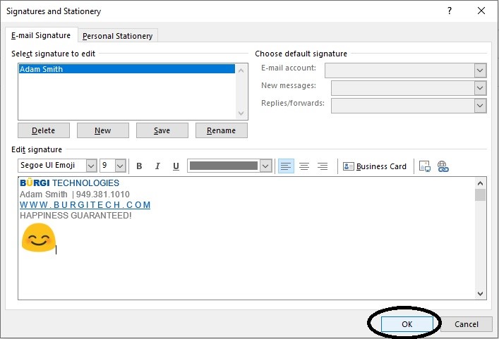If you have finished all the 6 steps above, congratulations - you have learned how to set up an email signature in Outlook Desktop! If this does not work for you, you can always visit Outlook Online and add an email signature there. Click here to read more about Outlook Online. On the other hand, our IT specialists at Burgi Tech are always available to help you with any question related to Outlook, Email, or even more. Contact us right now! Learn more about our Orange County IT support.