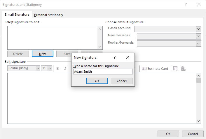 Then, Outlook will allow you to add a name to your new signature. To avoid confusion, let’s name the signature with your name. In this example, we use ‘Adam Smith’. Please feel free to use your name or nickname for convenience. Select ‘OK’ when you finished.