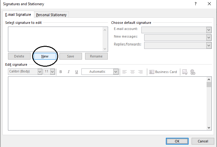If you have succeeded on the previous step, good job, you are halfway done. The ‘Signature and Stationery’ box will pop out on your screen. Assuming that you have never set up a signature in Outlook before, under ‘Select signature to edit’, click ‘New’.